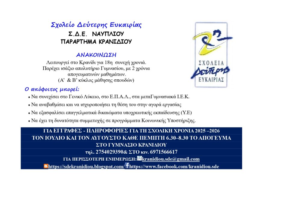 Σας ενημερώνουμε ότι θα είμαστε κάθε Πέμπτη στο Γυμνάσιο Κρανιδίου από τις 6.30 μμ μέχρι τις 8.30 μμ για τους καλοκαιρινούς μήνες Ιούλιο – Αύγουστο για τις εγγραφές στο Α κύκλο μάθησης του σχολείου Δεύτερης Ευκαιρίας στο Κρανίδι.