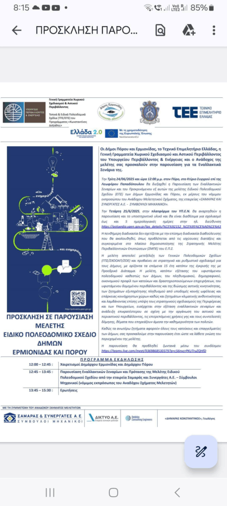 Σήμερα θα παραβρεθούμε στον Πόρο στις 12.00 το μεσημέρι στην παρουσίαση των βασικών κατευθύνσεων της μελέτης για το ειδικό πολεοδομικό σχέδιο του Δήμου Ερμιονίδας, Κατόπιν προσκλήσεως του Δήμου Ερμιονίδας .