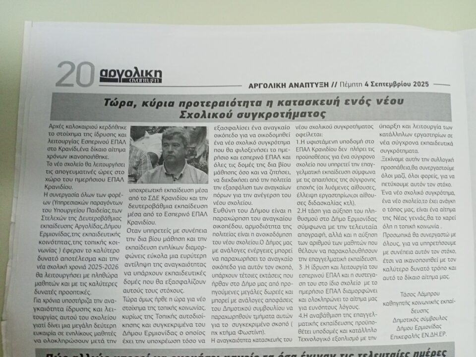 ην προηγούμενη εβδομάδα δημοσίευσα στην Περιφερειακή εφημερίδα “Αργολική ανάπτυξη” ένα άρθρο για την αναγκαιότητα κατασκευής ενός νέου σχολικού συγκροτήματος που θα στεγάσει το Ημερήσιο και εσπερινό ΕΠΑΛ καθώς και όλες τις δομές της επαγγελματικής εκπαίδευσης και κατάρτισης.