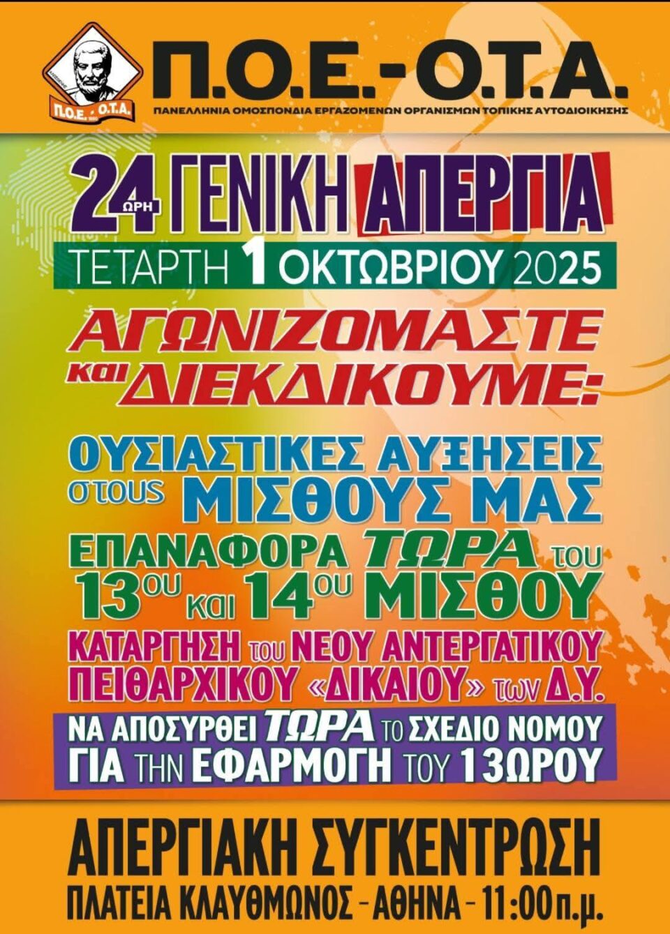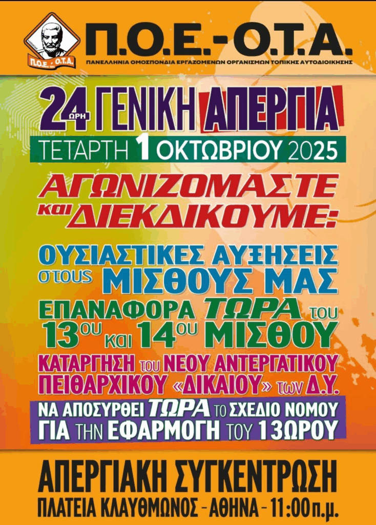 Σήμερα 1η Οκτωβρίου 2025 , ημέρα γενικής Απεργίας,σε αυτήν συμμετέχουν και οι εργαζόμενοι της τοπικής αυτοδιοίκησης.