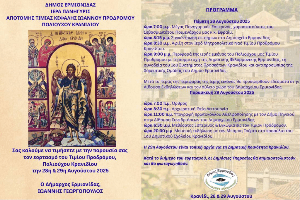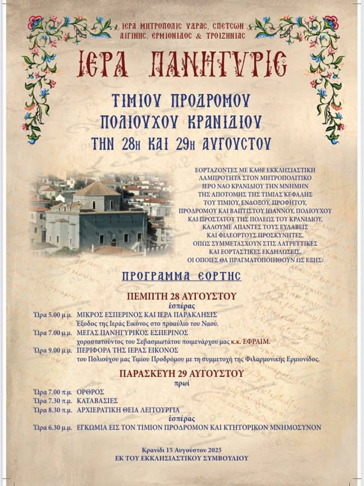 Από σήμερα το απόγευμα ξεκινούν οι εορτασμοί για να τιμηθεί , ο Μητροπολιτικός Ναός Κρανιδίου,ο ιερός Ναός του Τιμίου Πρόδρομου στο Κρανίδι ,ο πολιούχος της πόλεως του Κρανιδίου.